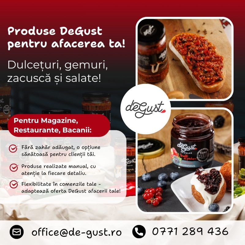 Dacă vrei să aduci ceva special în afacerea ta și să oferi clienților produse cu adevărat deosebite, DeGust este partenerul potrivit. Produse artizanale, realizate manual, fără aditivi sau conservanți, care adaugă valoare reală ofertei tale.