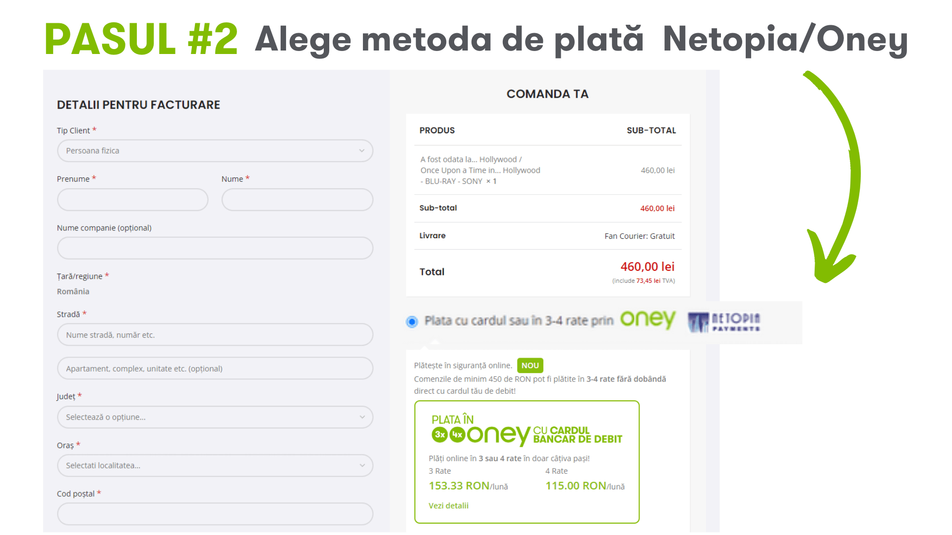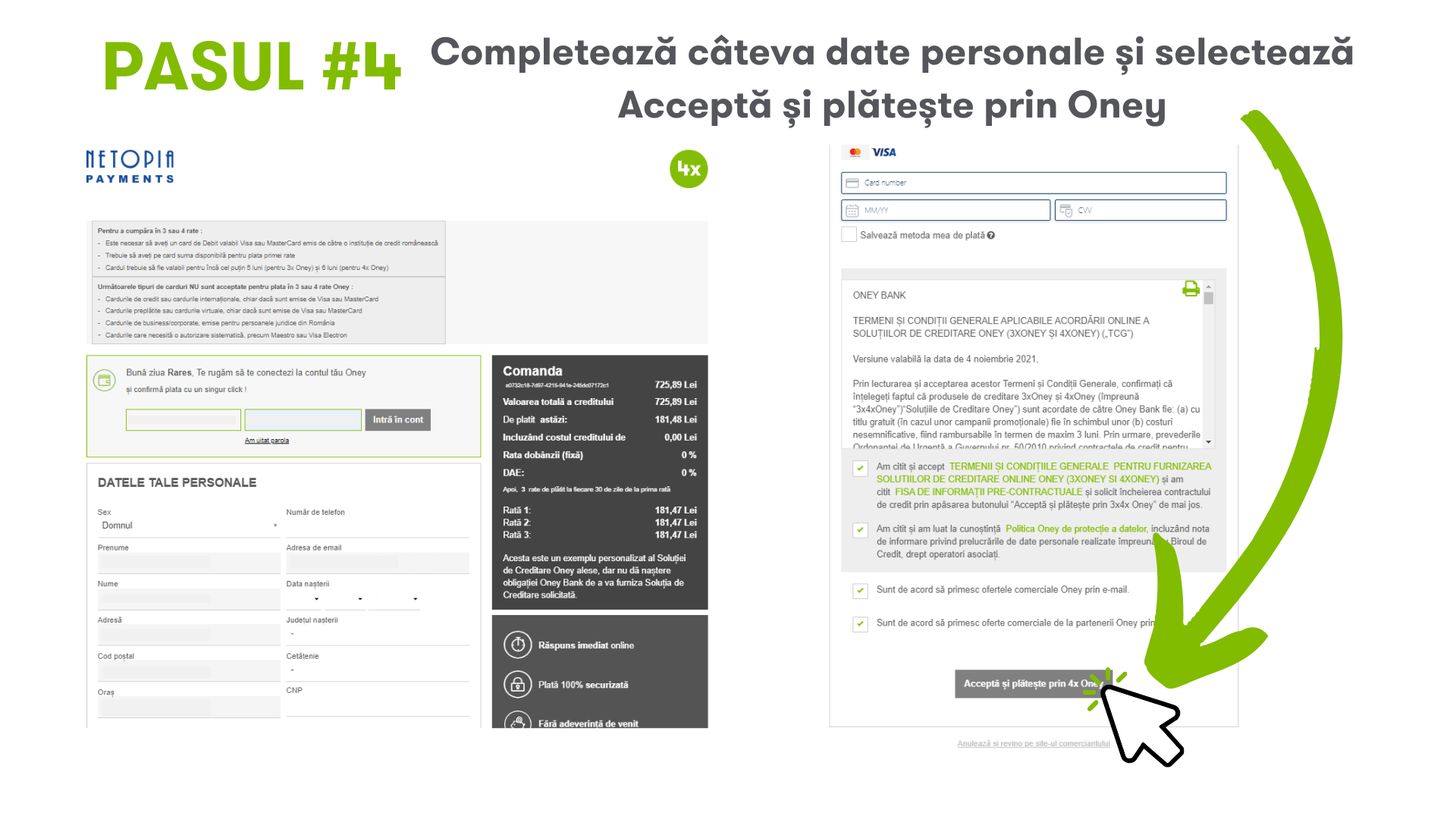 4. În pagina de plată Netopia, vei bifa plata prin Oney (sus în partea dreaptă) și vei fi redirecționat către pagina de plată Oney, unde completezi datele solicitate.